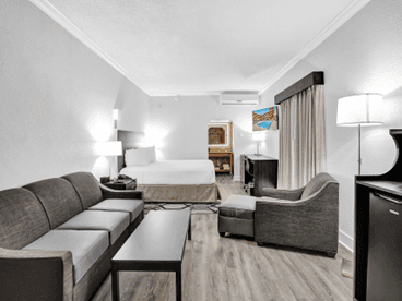 Stretch out in style. This spacious suite is outfitted with soothing décor and contemporary furnishings. It features a plush King bed and a separate sitting area with a pull-out sofa bed to accommodate extra guests. Complete with a work desk, fridge, and 50" HDTV, it’s perfect for longer stays.