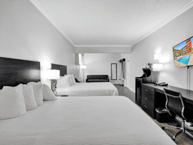 Bright, airy, and perfect for sharing. This spacious room features two Queen beds and a sleek, modern design. Enjoy the convenience of a mini-fridge and a 50" HDTV, providing the perfect backdrop for your Hollywood getaway.
